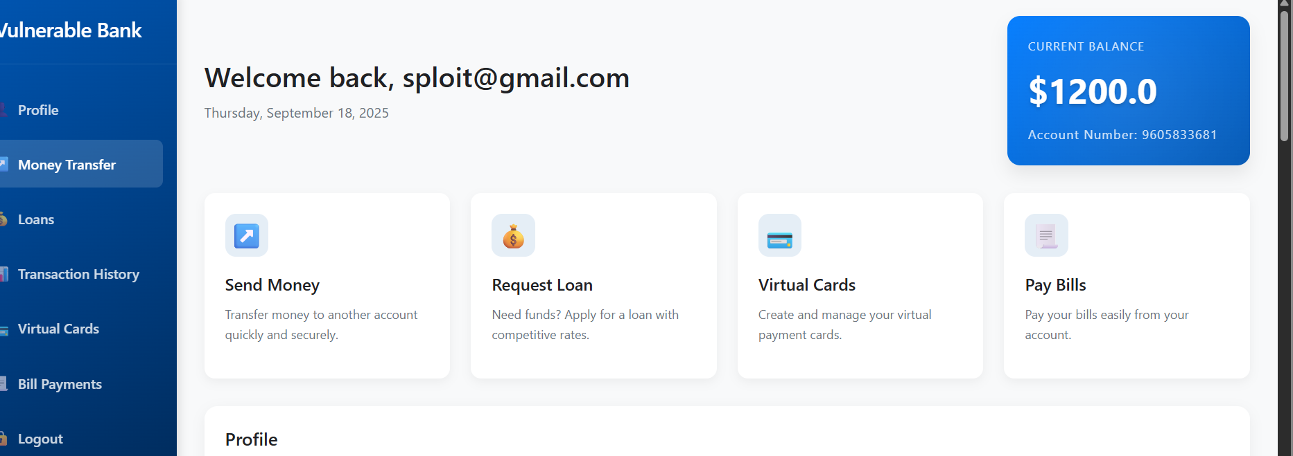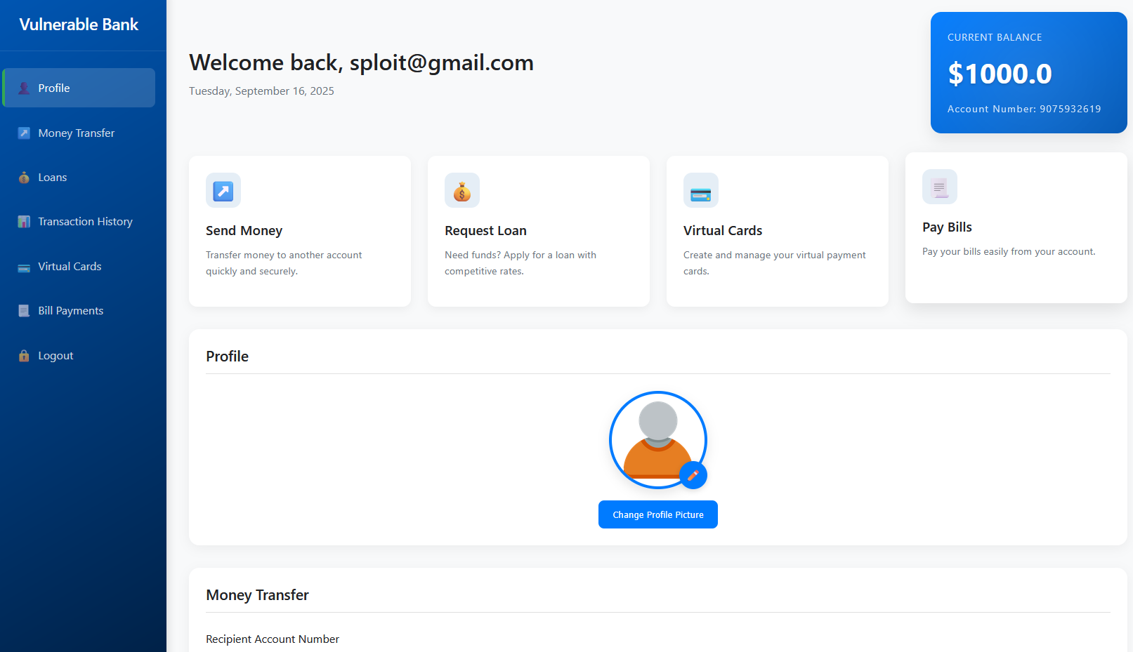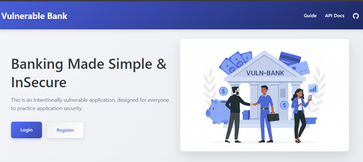 Once the application launches, it's immediately clear that it mimics the typical features you'd expect in a modern online banking platform. Users can register, log in, view account balances, transfer funds, pay bills, apply for loans, and manage cards. These are core workflows that real financial applications also implement, which makes the lab both engaging and realistic. Our goal here is explore not just the functionality, but also the common vulnerabilities that often accompany such features.