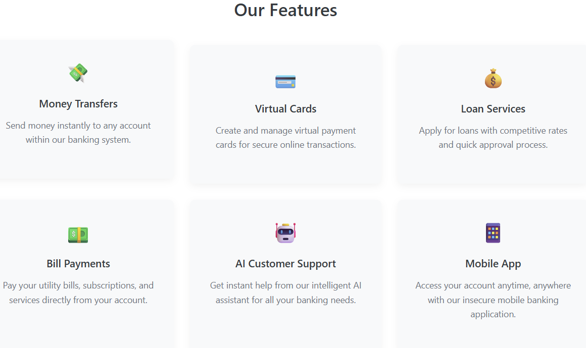 In practice, as an attacker the approach here is to start by mapping out the attack surface and identifying potential entry points. Typical attack vectors that came to my mind based on the features include: - Authentication Bypass Attempts: Testing for weak or misconfigured login mechanisms. - Enumeration Opportunities: Looking for differences in error messages or responses that reveal valid usernames or accounts. - Parameter Tampering: Modifying values in requests (e.g., account numbers, transfer amounts) to see if server-side validation exists. - Checking whether tokens are predictable, improperly scoped, or lacking secure flags well known as session hijacking - Probing for injection flaws in endpoints that handle transactions or search queries. - Business Logic issues: Exploring whether processes like loan approvals, manipulating account balance, unathorized transfer. or card creation can be bypassed or tricked by manipulating request flows. - LLM related vulnerabilties.