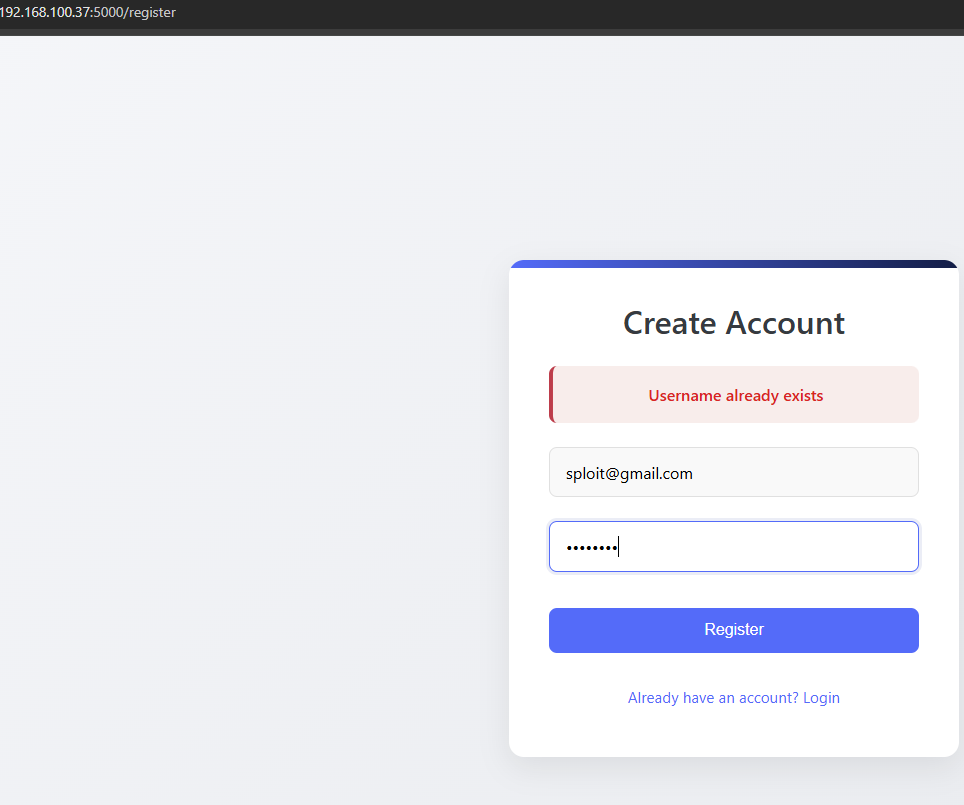 When attempting to register an account with an existing username, the application responds with a message such as "username already exists." Attackers can use this to enumerate valid users by automating registration attempts with a list of common usernames or leaked credentials. This greatly aids targeted brute-force or credential-stuffing attacks.