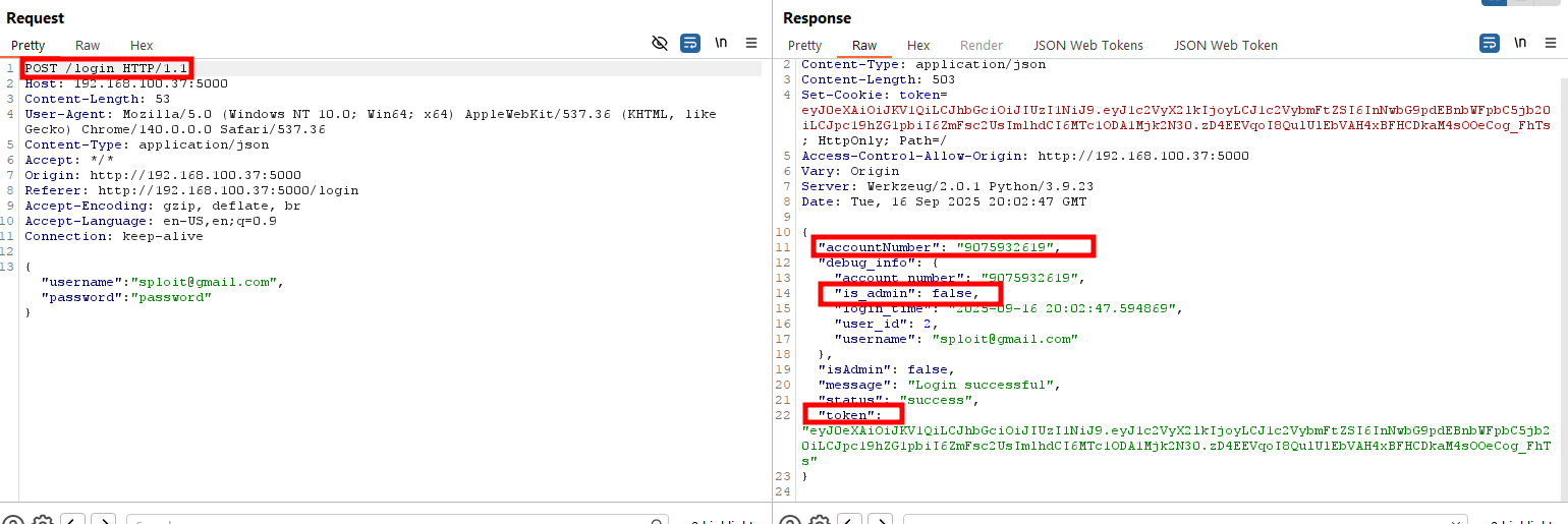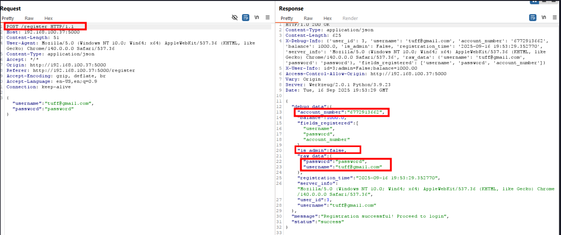 Upon intercepting the registration request, I observed that the application returns excessive and sensitive information in the response payload. This included fields such as accountNumber, debuginfo, account_number, is_admin, and user_ID, these values should never be returned at the point of registration, as they provide unnecessary insights into backend logic and internal identifiers.