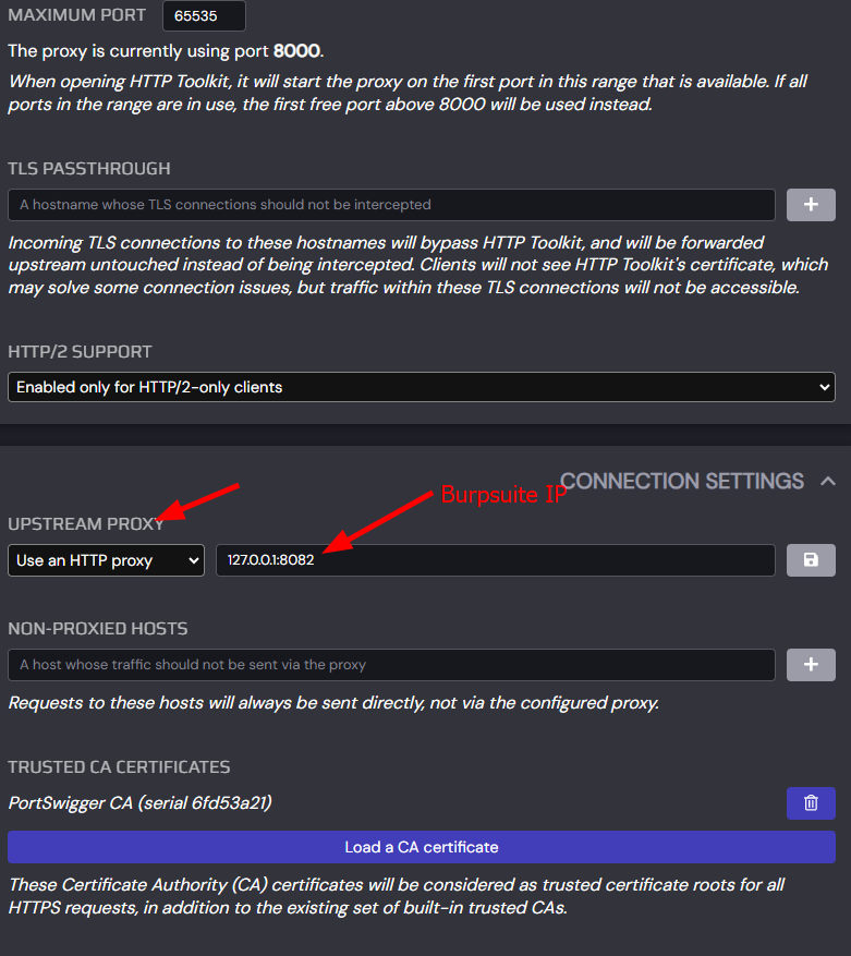 Having explored the frontend of the application, we can now begin our application security review with the goal of hunting for vulnerabilities. You can fire up proxy tool of your choice, for my case I will be using HTTP Toolkit and configured it with an upstream proxy to Burp Suite.