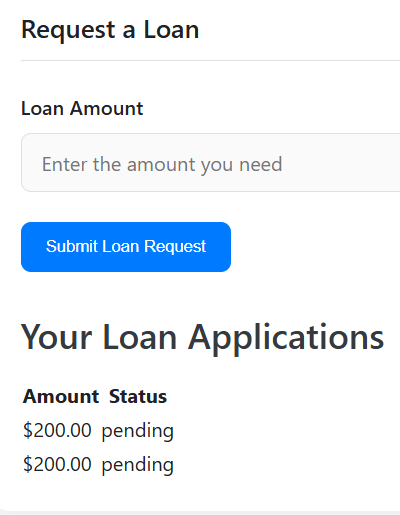 While testing the loan application process, I observed that the request is accepted upon submission but still requires approval before it is finalized. This indicates the presence of a maker-checker workflow, where administrative users (e.g., loan officers or managers, administrators) must authorize or reject loan requests.