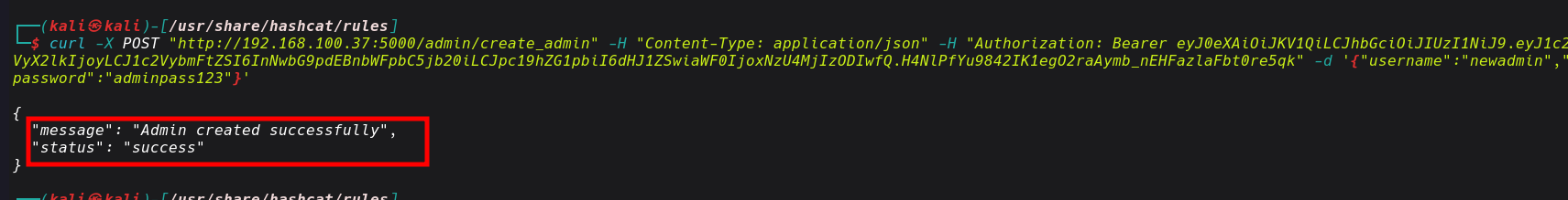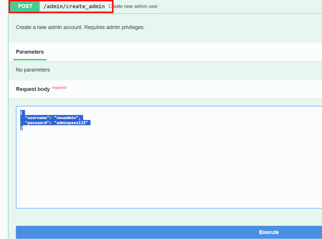 curl -X POST "http://192.168.45.143:5000/admin/create_admin" -H "Content-Type: application/json" -d '{"username":"newadmin","password":"adminpass123"}'
