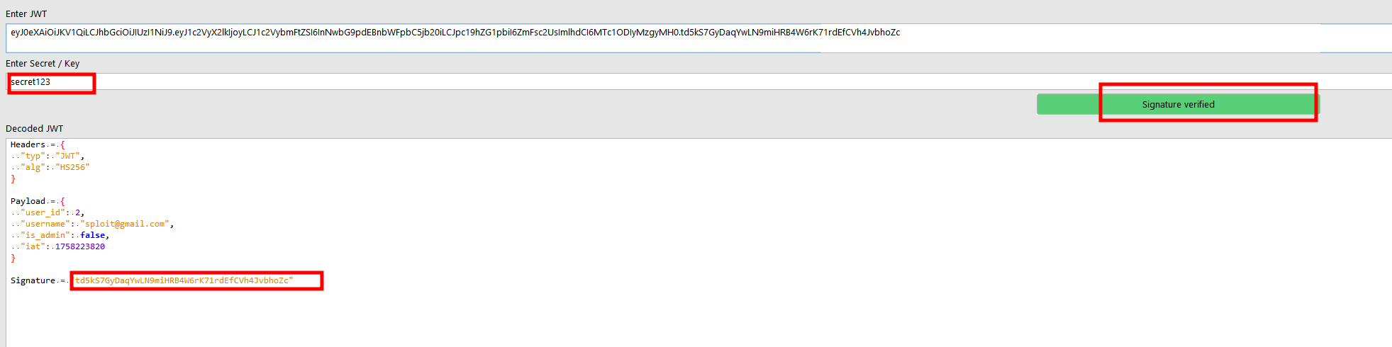 [+] secret123 is the CORRECT key! We can verify this using burp suite and re-sign arbitrary JWTs after tampering with the payload claims.