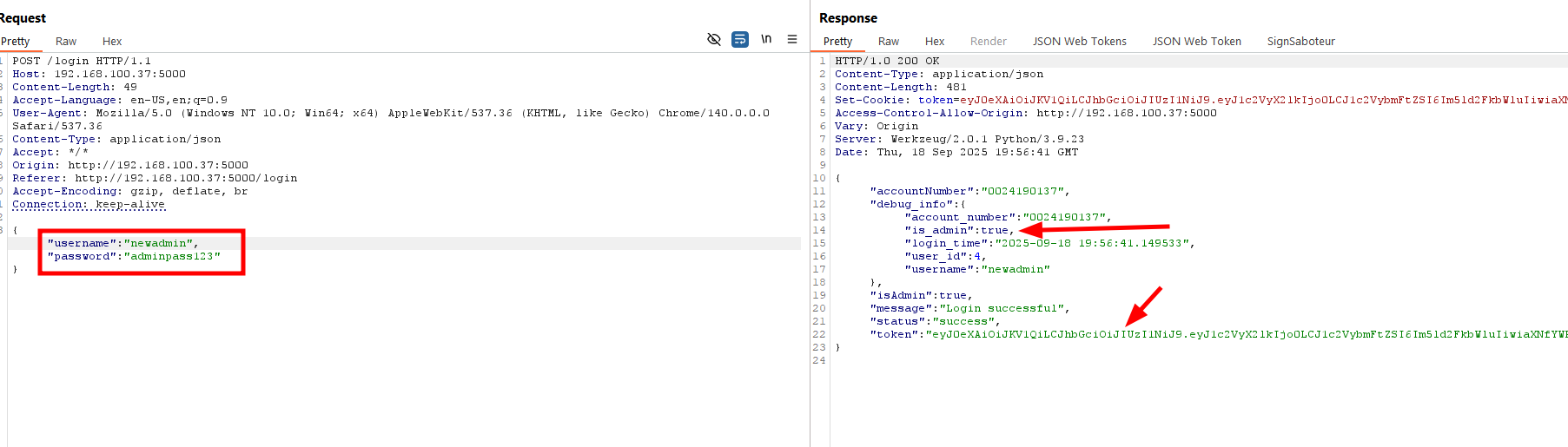 The application uses JWTs for session management but relies on a weak secret (secret123) to sign tokens. Once the secret is discovered, attackers can forge arbitrary tokens. By modifying the is_admin claim, I escalated privileges from a normal user to an administrator and successfully created a new admin account.