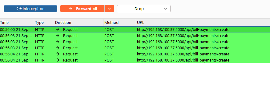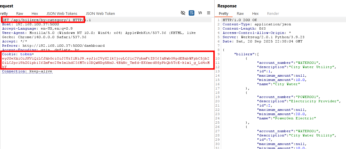 The /api/billers endpoint responds to requests even without an authentication token. This means attackers can directly query the endpoint without logging into the application Request A