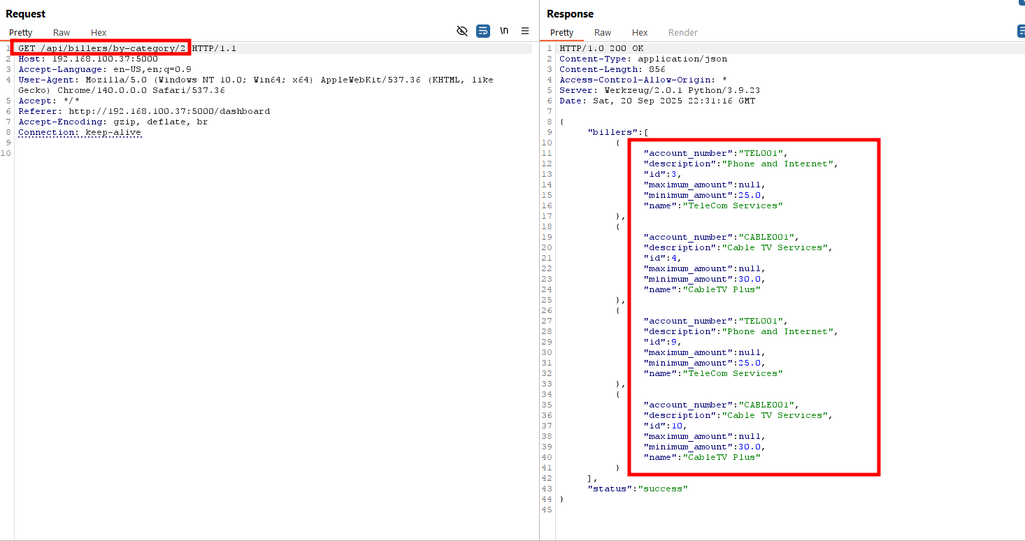 Attackers can enumerate billers by tampering category IDs. | Validate inputs, apply authorization, and limit disclosure. |