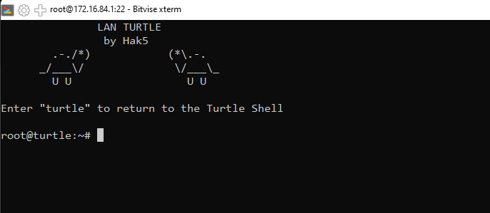 Once it's connected, the Turtle typically sits at 172.16.84.1, and it runs an SSH server by default.