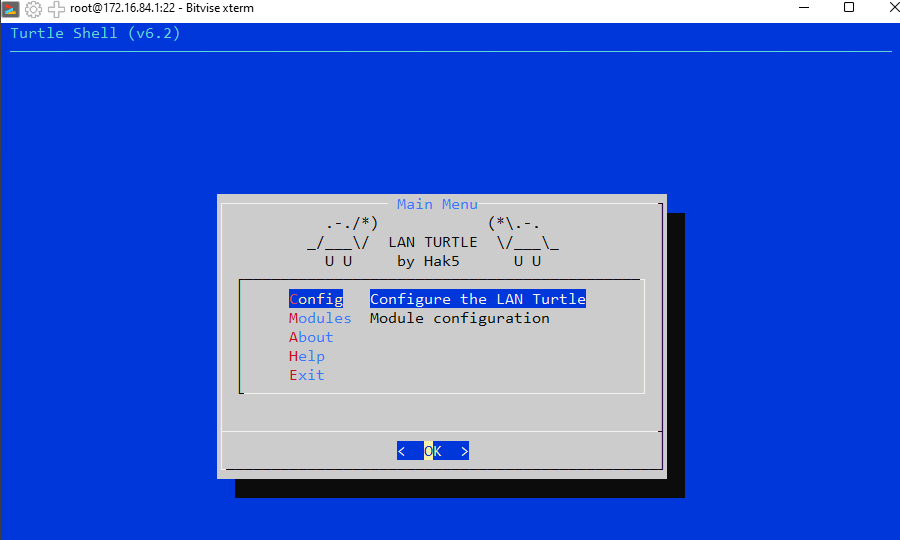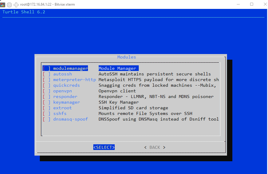 Once inside, you'll see the Turtle Shell, a simple ncurses-style interface where you can configure modules, install new payloads, and manage your backdoor.