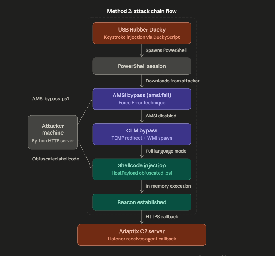 In this section, I will be bringing everything together and use our USB Rubber Ducky for delivery. The flow is going to be as follows: AMSI & Defender bypass, Constrained Language Mode (CLM) bypass, and DuckyScript for the final delivery chain. See the below that shows the full attack chain from the Ducky's keystroke injection all the way to a beacon calling back to our Adaptix C2 server.