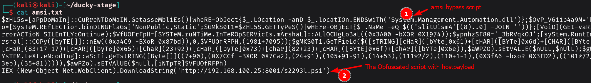 Once everything is staged, the final amsi.txt file combines both the AMSI bypass and the HostPayload-obfuscated shellcode into a single script. As you can see from the screenshot below, the file has two key parts.